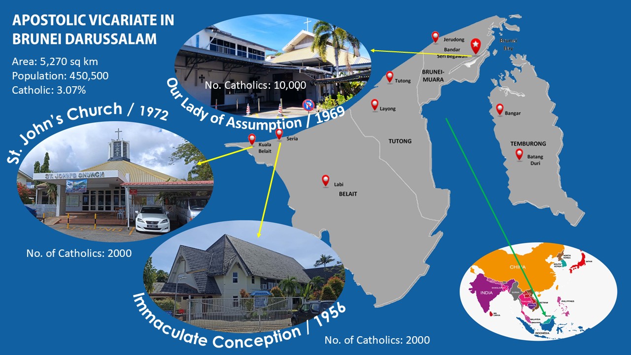 The Vicariate has 3 parishes; namely, the Church of Our Lady of the Assumption in Bandar Seri Begawan; the Church of Our Lady of the Immaculate Conception in Seria; and the Church of St John in Kuala Belait. The vicariate has several smaller Catholic communities in the country. (See map for approximate location of the parishes in Brunei Darussalam)